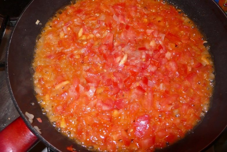 Лук уже подрумянился, закидываем в него нашу томатно-помидорную смесь.