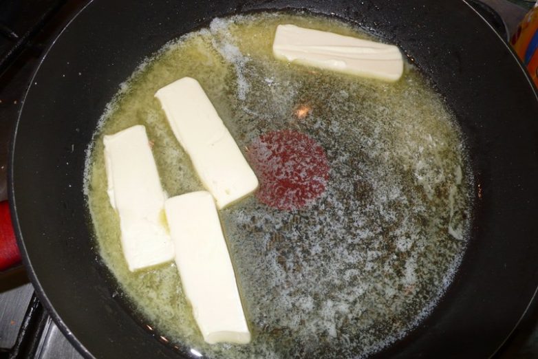 Сковородку на огонь, масло в сковородку, топим. Скучно дожидаться пока оно целиком растает, да и незачем -может начать пригорать.