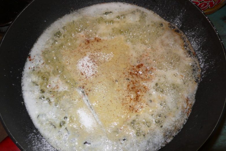 Ложку муки через сито высыпаем в сковороду. В роли стороннего наблюдателя следим за процессом. Помешивать лениво, само сделается как надо.