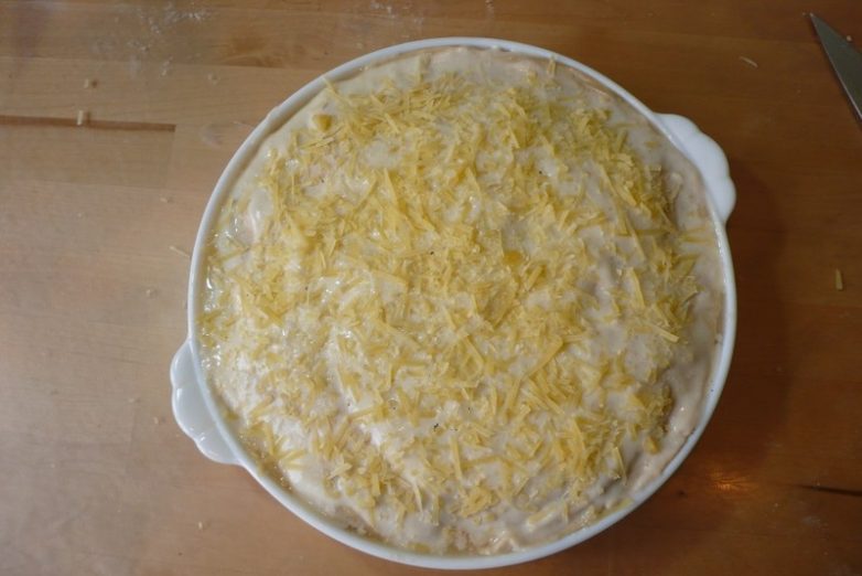 Крайний кусок теста поливаем обильно остатками соуса бешамель, посыпаем сыром (много сыра не бывает).