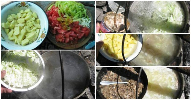 Что необходимо для того, чтобы сварить борщ с грибами и тушенкой в котелке: