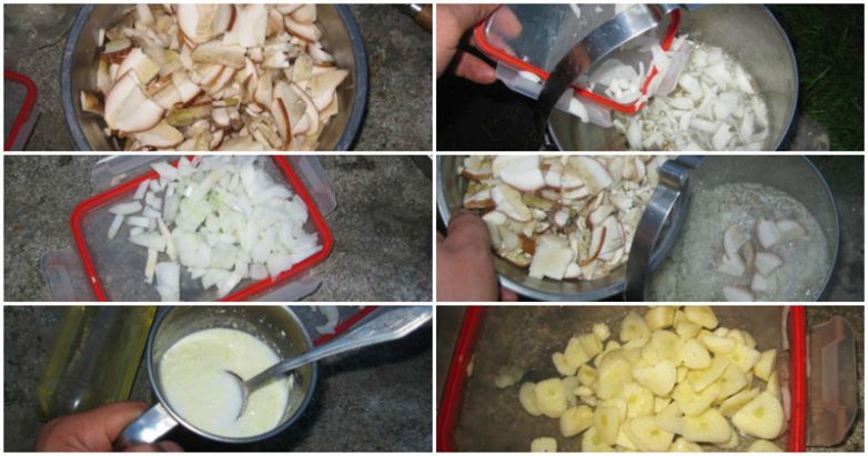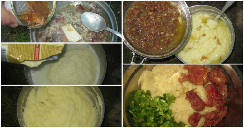 Автор использует сухой картофельный концентрат, но можно использовать и обычную картошку — кто чем располагает! Конечно, с обычной картошкой вы получите блюдо и вкуснее и полезнее, чем с концентратом, единственный плюс которого в том, что не надо тянуть с собой тюки с картошкой. :)