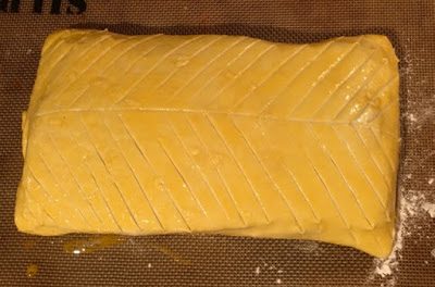 Смазываем верх свертка из теста оставшимся взбитым яйцом. Острым ножом наносим на тесто узор по типу «селедочного скелета» :)