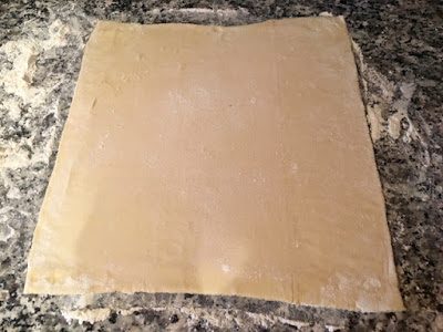 Лист слоеного теста слегка раскатываем на присыпанной мукой сухой рабочей поверхности.