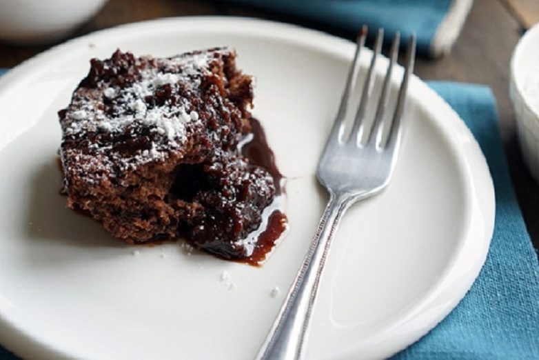 Представляет он из себя совершенно потрясающий и мягкий шоколадный бисквит, который сам себя пропитывает шоколадным же соусом. В результате получается невероятная текстура почти липкого шоколадного мякиша. Ложка за ложкой он практически мгновенно исчезает из формы, особенно хорошо есть его сразу же после приготовления.
