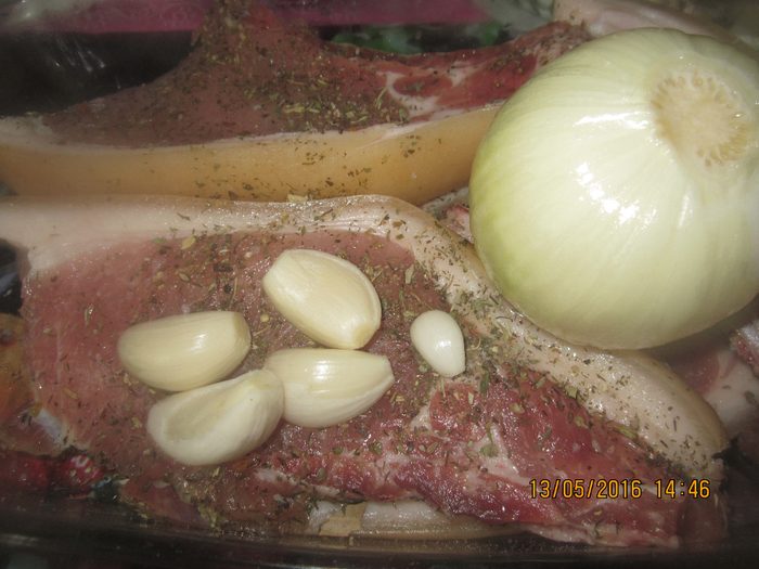 1,5 кг свинина (с прослойками жирка – шейка, грудинка)300 мл сухое красное вино 3-4 луковицы 4-5 зубчиков чеснока жир для жарки специи (кориандр, горчица зернами, перец лепестками, тимьян, чмп (чёрный молотый перец) соль