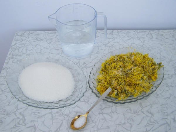 Под количество собранных головок одуванчика готовим пропорционально остальные продукты. Так выглядит «половинный» набор ингредиентов: 200 цветков, 0.5 л воды, 600 г сахара и 0.4 ч. ложки лимонной кислоты.