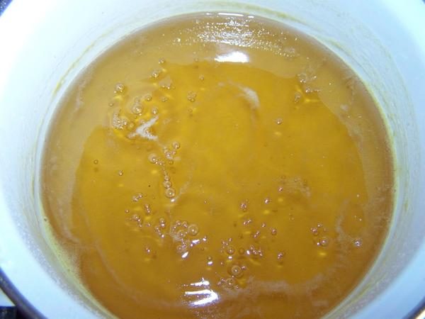 Как только отвар закипит, вы сразу увидите, как он на глазах превратился из мутно-жёлтого вот в такой прозрачный и красивый. Снова уменьшаем огонь и варим 30-40 минут. Чем дольше, тем гуще будет становиться варенье.