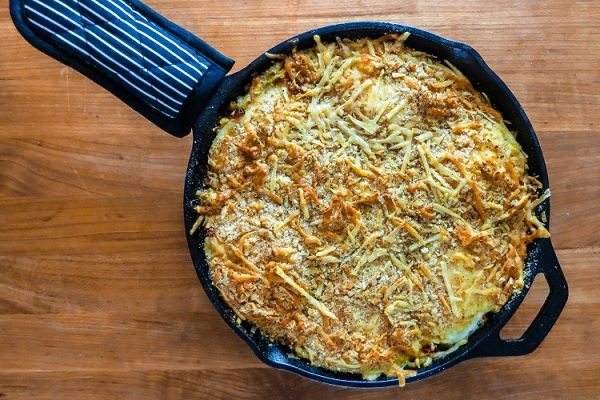 Смешайте в миске панировочные сухари с сыром. Половину этой смеси добавьте к луку на сковороде. Ложкой сделайте углубления в сырно-луковой подушке по количеству яиц.