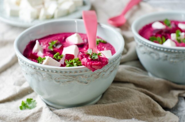 Оставшиеся огурцы, свеклу, сельдерей, зелень, кефир, соль измельчаем блендером до практически жидкого состояния.