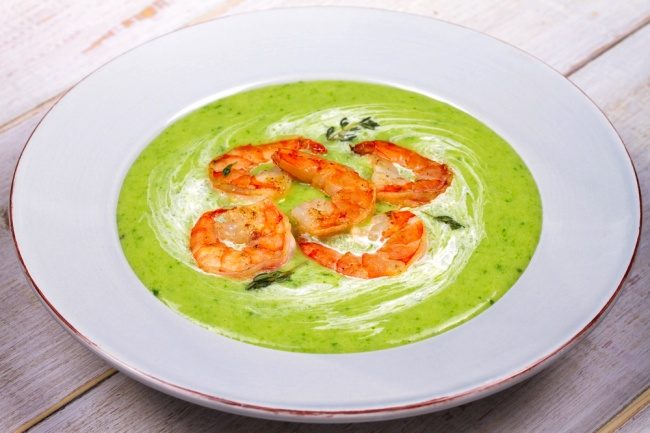 Выкладываем в тарелки окрошку, заливаем кефирно-овощной смесью, выкладываем несколько целых креветок и петрушку для украшения.