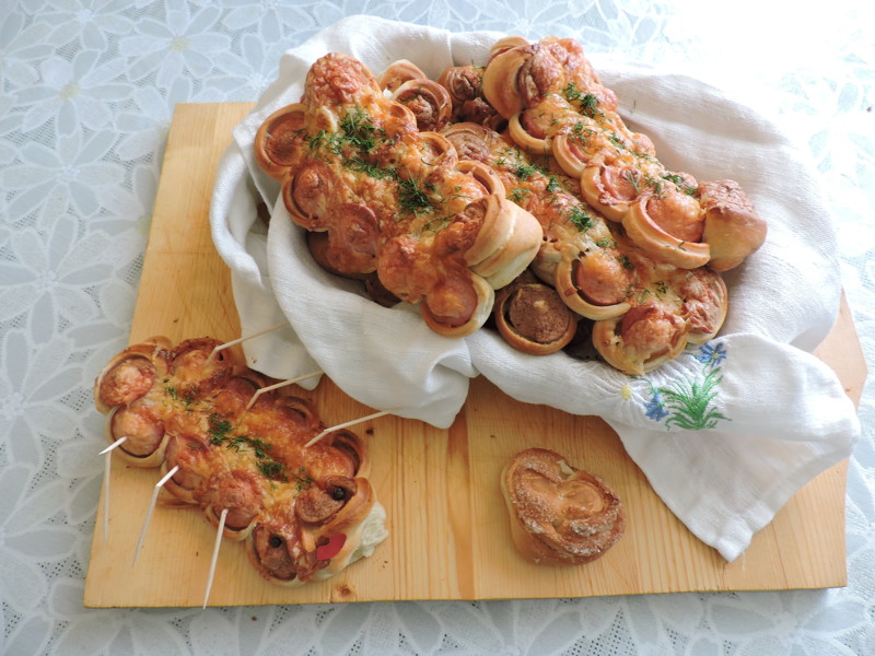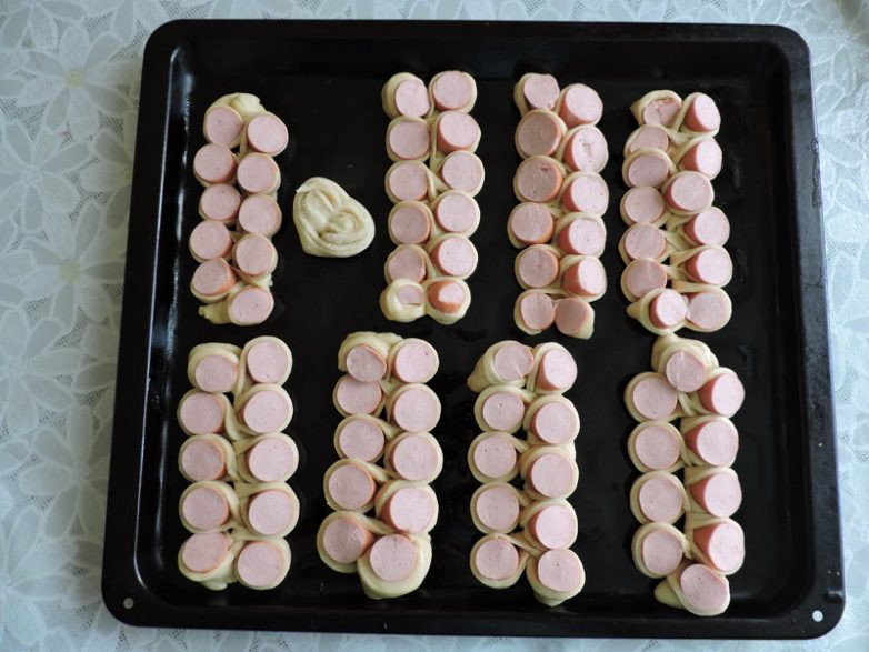 Каждый кусочек теста с сосиской кладем в разные стороны, и одновременно разворачиваем, чтобы разрезанный кусочек сосиски смотрел вверх.