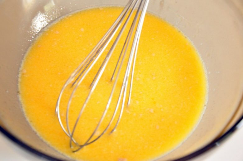 Яйца разбалтываем до однородности с солью. Яйца должны быть комнатной температуры! Если вы не успели заранее вытащить яйца из холодильника, окуните их в теплую воду на пару минут.