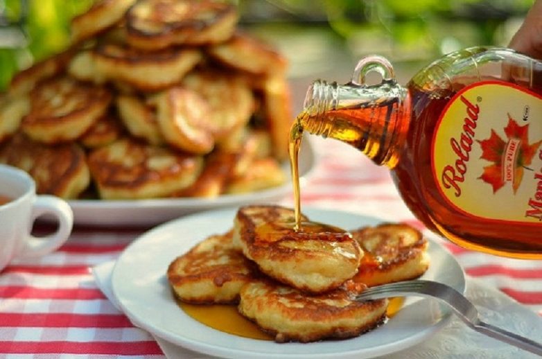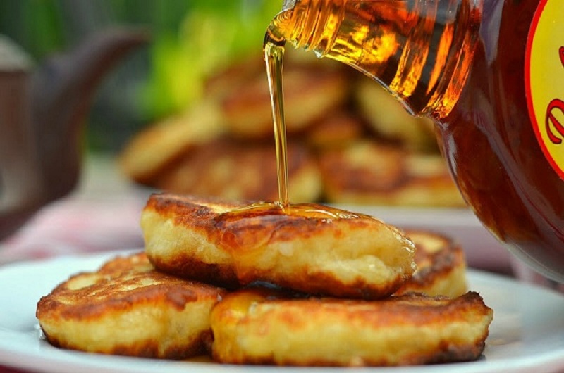 Поливать можно кленовым сиропом, но можно поливать чем душе угодно, сметаной, вареньем, джемом, медом, йогуртом, ягодным соусом и так далее.