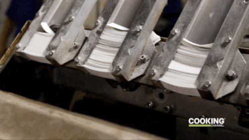 Источник: img.enkivillage.comВам когда-нибудь доводилось надкусывать печенье с предсказаниями? А задумывались ли вы, как бумажка с предсказанием попадает в печенье? Оказывается, ее впечатывает в тесто не слишком аппетитного вида компрессор, после чего автомат заворачивает тесто вокруг бумажки. Печенька выпекается уже с предсказанием внутри.