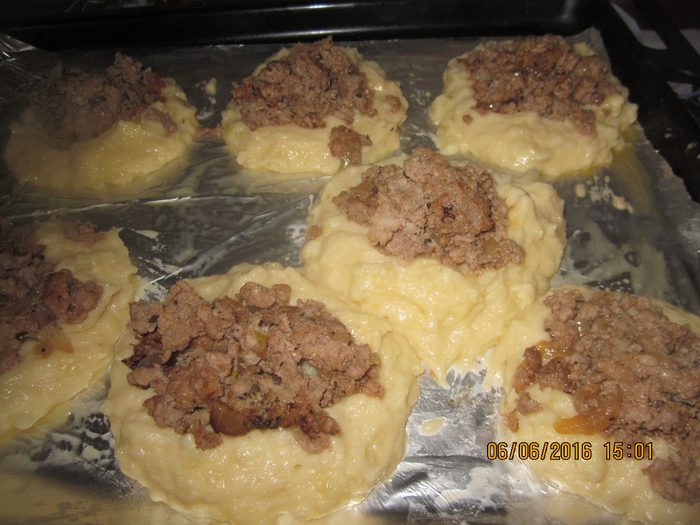 Тесто остудить, разделить на кусочки. Из каждого кусочка сделать небольшую лепёшку, выложить их на смазанный противень застеленный пергаментом. Каждую смазать взбитым яйцом, выложить сверху начинку, посыпать тёртым сыром.