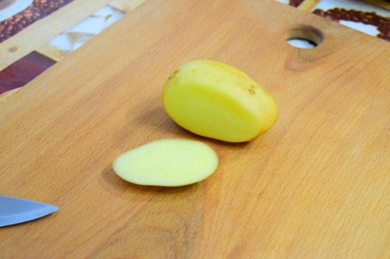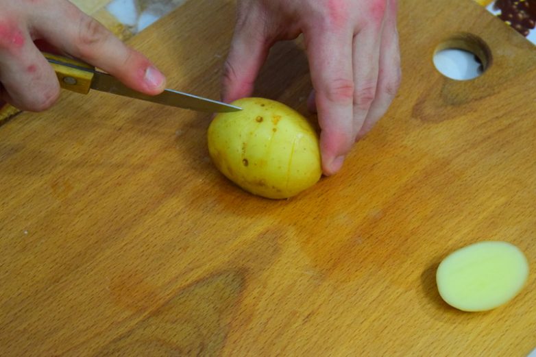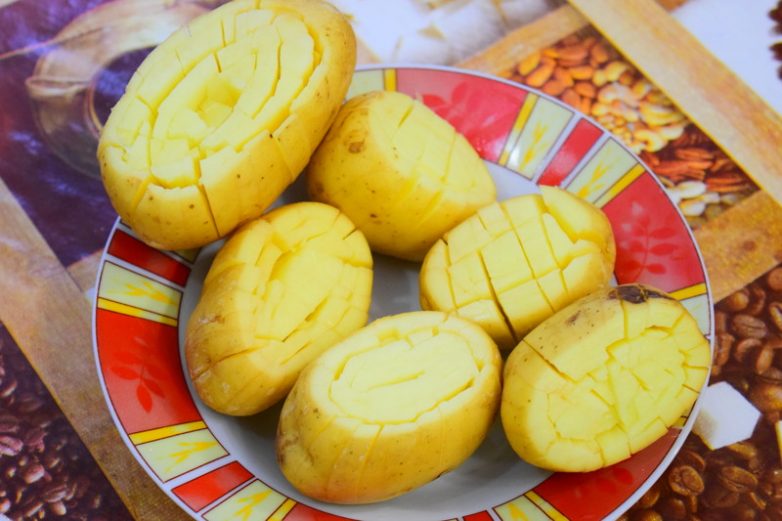 Делаем прорези по овалу картошки (можно в один ряд можно в два, на сколько позволяет сама картошка)