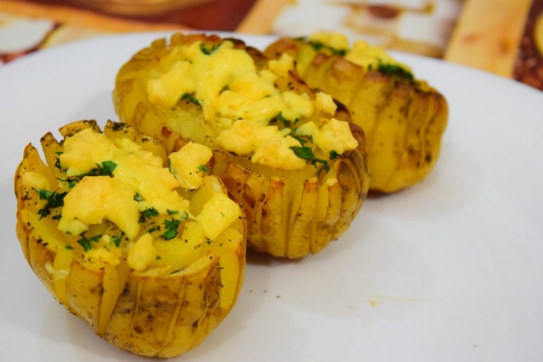 Хороший рецепт. Но банальный и не оригинальный. Я так картошку запекаю уже наверное лет 20. Но если в прорези картошки положить кусочки сала, да ещё и чесночка, то никакого сыра не надо. Пальчики оближешь!