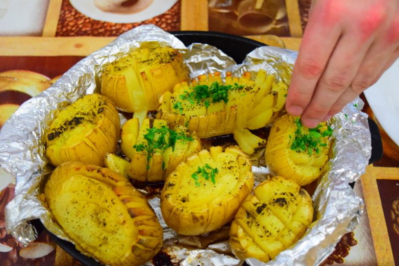 Спустя 30 минут достаем пропекшуюся картошку и посыпаем зеленью