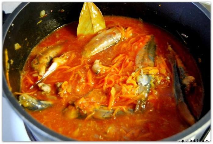 Влить томатный сок который заранее посолить, посладить, поуксусить и на медленном огне томить около часа (я по мягкости костей ориентировалась) не перемешивать часто иначе рыбка превратится в «кашу».