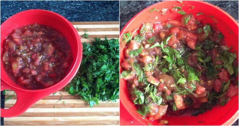 С помидоров снимите кожицу, предварительно подержав их несколько секунд в кипятке, и нарежьте мелкими кубиками. Зелень также порежьте мелко и смешайте с помидорами. Дайте немного постоять, образовавшийся сок слейте.