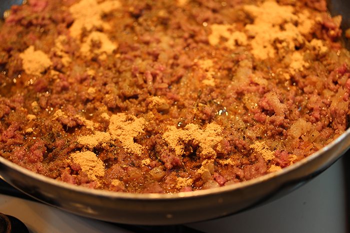 Кроме того, помимо, собственно, мяса (обычно — говядины) и традиционного лука, в ней используется достаточное количество добавок и специй. Получается очень вкусно.