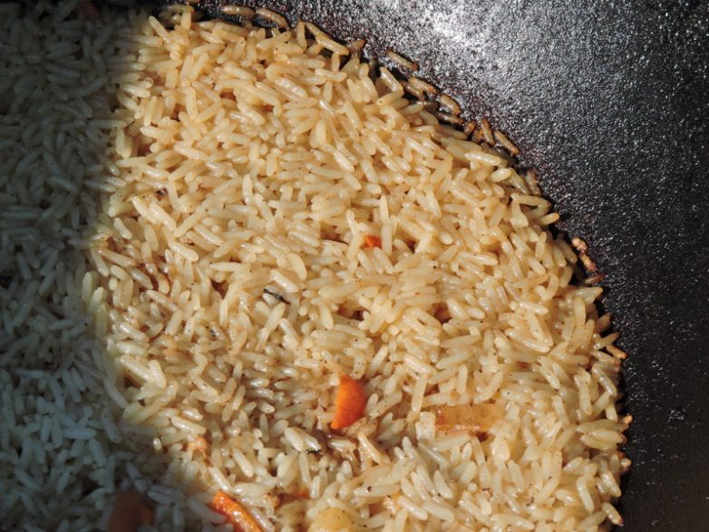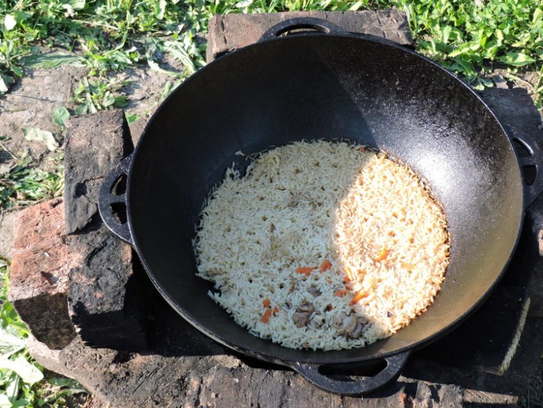 Всё как обычно, но выглядит неаппетитно. Правильнее будет после обжарки курицы с морковью и луком заложить рис и только потом залить горячей водой и готовить на небольшом огне один час под плотно закрытой крышкой.