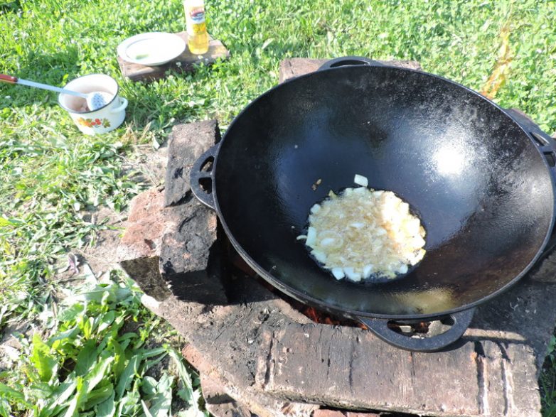 Разогреть 150 гр масла в казане, добавить лук. Обжарить до прозрачности