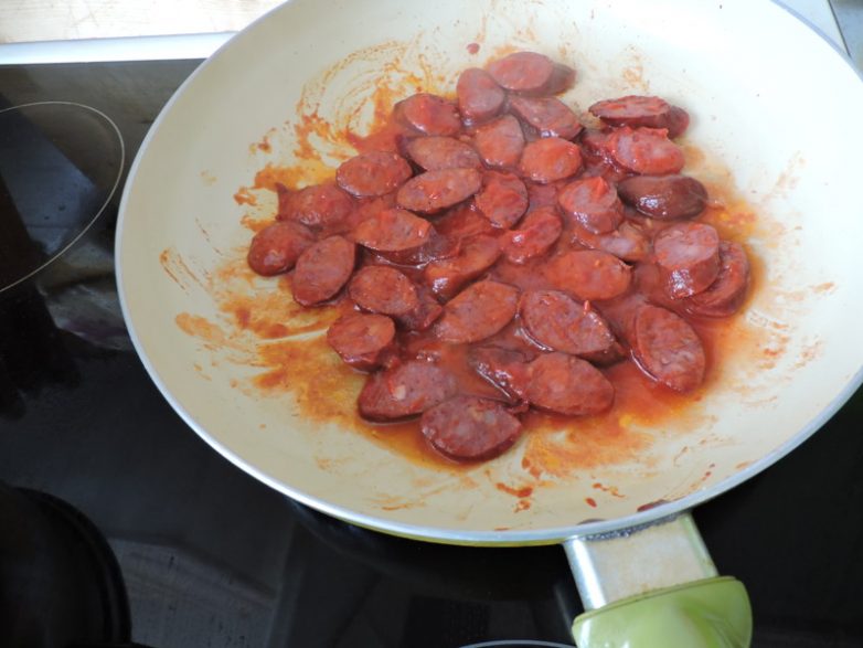 Как только наши овощи стали готовыми, добавляем колбаски. Выключаем огонь