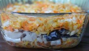 Затем форму смазываем растительным маслом и выкладываем: первый слой — половина смеси кабачка, морковки и лука; второй слой — рыбу; и третий — остальную половину смеси