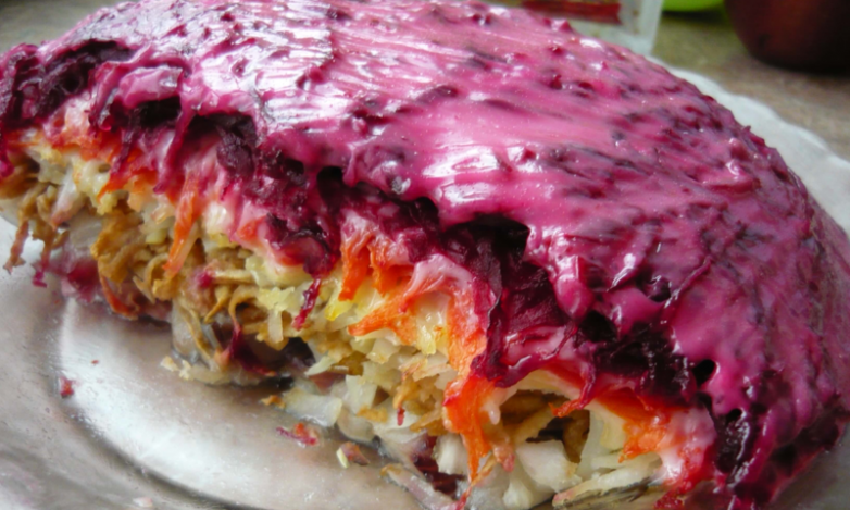 Любимый салат моей бабушки. Селёдку можно было достать практически всегда. Да и качество её опять же, было на уровне. Но одной солёной рыбой не наешься, поэтому к ней начали добавлять варёную свеклу, маринованный лук, майонез и другие ингредиенты. История не сохранила имя автора этого советского салата, но он прочно утвердился в арсенале многих советских хозяек. Кстати, лук лучше действительно использовать маринованный — его острота отлично сочетается со сладостью свеклы и солёностью селёдки. Готовится это чудо так: