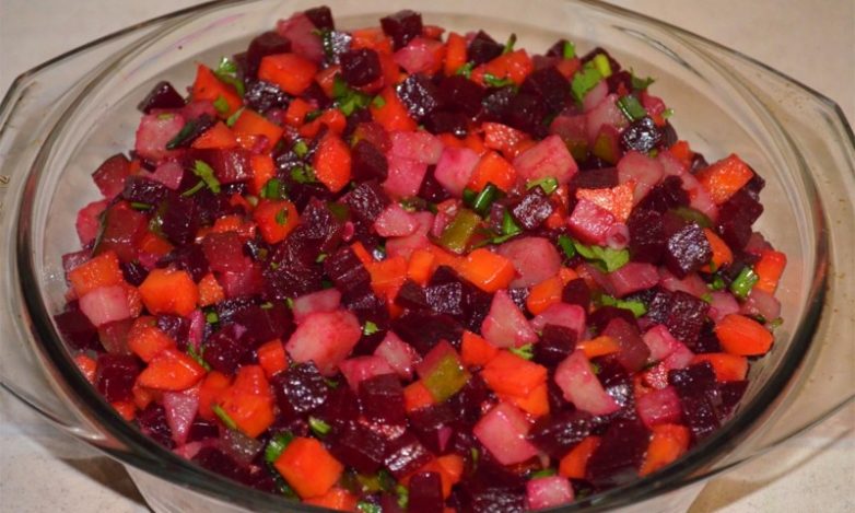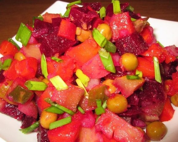 Оригинальный рецепт винегрета можно было обнаружить ещё в поваренных книгах за девятнадцатый век. Только там была телятина, мочёные яблоки, сливы, оливки и грибы. Короче, продукты, которые советскому человеку достать было затруднительно, мягко говоря. Стали упрощать, в результате чего появился один из самых популярных классических советских салатов. Готовится он так:
