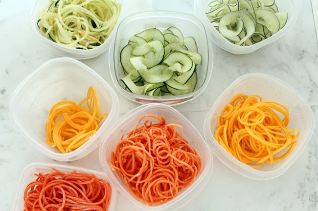Для экономии времени очень удобно чистить и резать овощи на салат заранее и класть их в специальные герметичные контейнеры. К примеру, нарезанная «лапша» из цукини сможет храниться в течение 3–5 дней, а нарезанные морковь, лук и перец могут лежать в холодильнике хоть целую неделю, если правильно их упаковать.