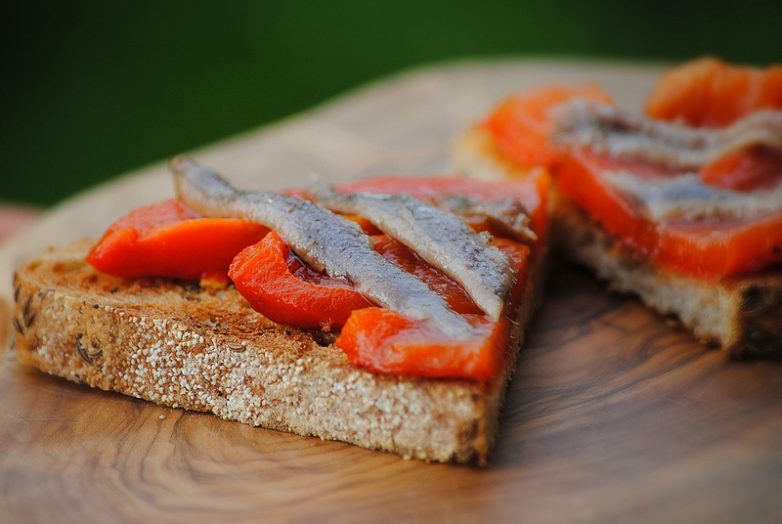 Ломтики хлеба поджарил до хрустящей и румяной корочки. Слегка натер ее чесноком — нужен только запах, но не вкус.На хлеб уложил полоски перца. Филе соленого анчоуса слегка отбил тупой стороной ножа и уложил сверху.
