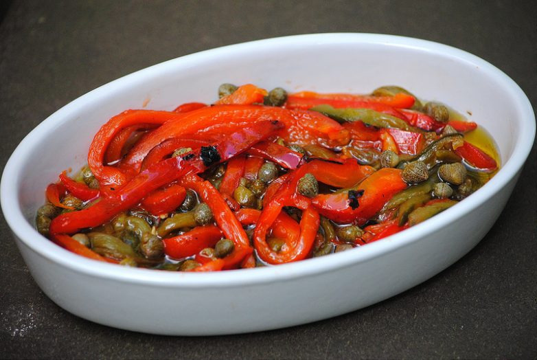 Перцы очистил от семян и нарезал длинными и тонкими полосками. Добавил соленых каперсов и масла оливкового плюхнул не жалея.