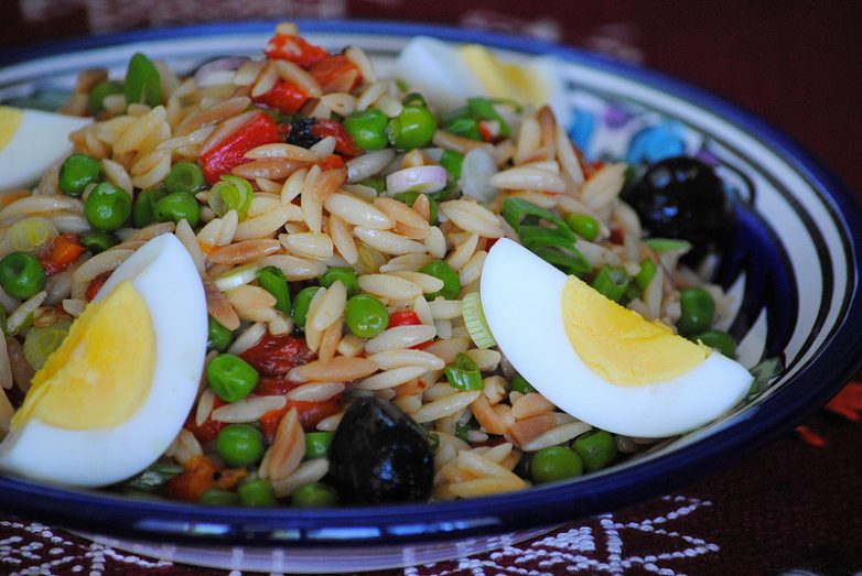 Мелкопорубленый перец, петрушка, чеснока растертый с филе соленого анчоуса, цедра и сок лимона, мелкие соленые каперс/цы, оливковое масло и отваренная мелкая паста.