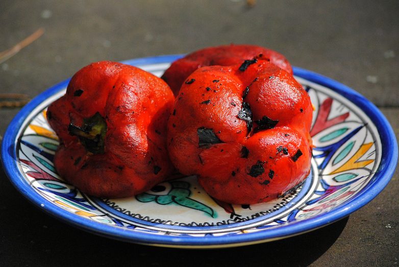Перцы выкладываются прямо на горячие угли и переворачиваются по мере того, как их шкурка обугливается. Этот процесс очень быстрый — на каждый перец понадобится около пяти минут. Конфорка газовой плиты с этим делом так же неплохо справляется.