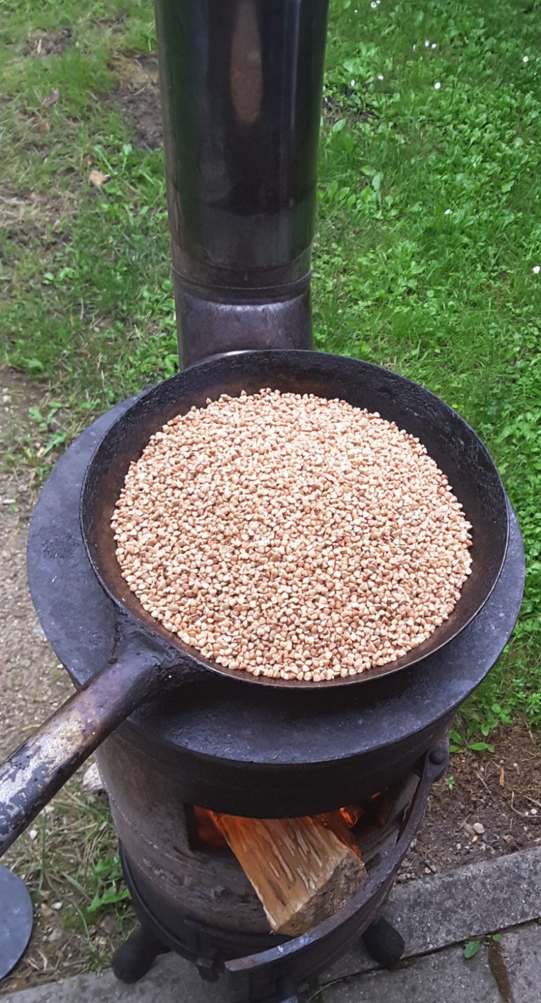 Обжарим гречку, постоянно помешивая, до золотистого цвета, 4–5 мин. Гречка станет очень ароматной. Можно было обжарить и в казане :-)
