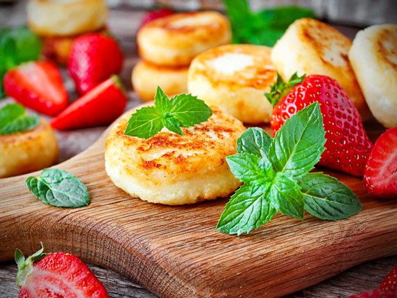Готовые идеальные сырники подавать со сметаной (джемом или сгущенкой), свежей клубникой или мятой.