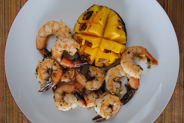 Манго, очищенные креветки с хвостиком, сливочное масло, чеснок, имбирь, черный перец и соль.