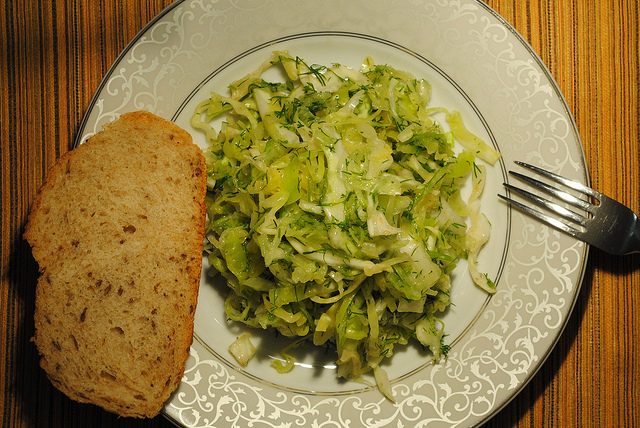 Свежая капуста, зеленое кислое яблоко, укроп, лимонный сок, оливковое масло, соль.