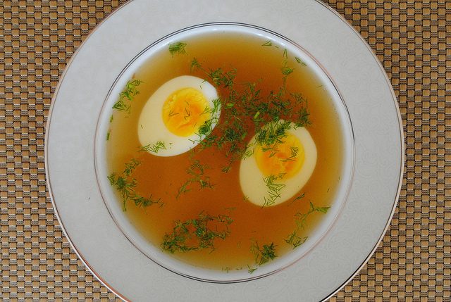 Красный говяжий бульон, яйцо и укроп.