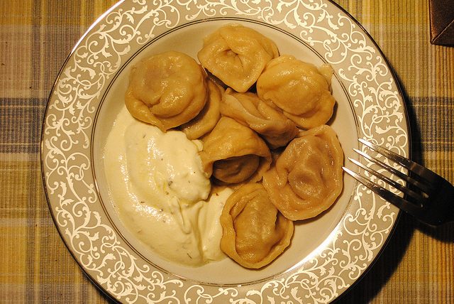 Рецепт из книги 15-го века: сделай тесто из пшеничной муки и воды, раскатай, положи мясо и залепив, вари в бульоне до готовности.