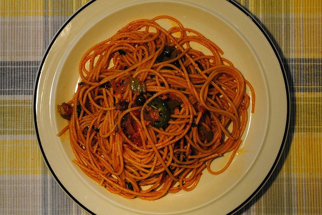 Паста и томатный соус (помидоры, петрушка, жгучий зеленый перец, чеснок, лук, оливковое масло, каперсы и соль).