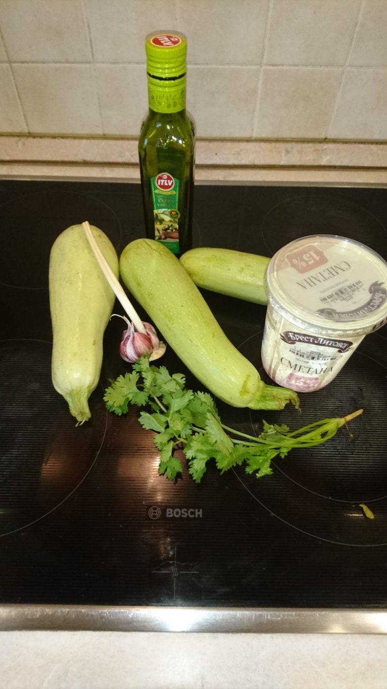 Собираем блюдо.В пиалу выкладываем немного соуса, затем слой кабачков, снова сметана… ну, все слоями.