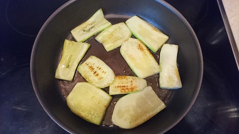 Кабачки очищаем от шкурки, режем на ломтики, и обжариваем в растительном масле. Степень прожарки на свой вкус. Если есть необходимость и желание поджаренную партию выкладываем на чистую бумажную салфетку (бумажное полотенце) и удаляем излишки масла.