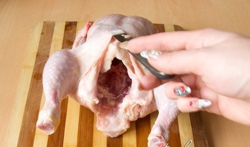 Переворачиваем курицу и обрезаем ей хвостик.