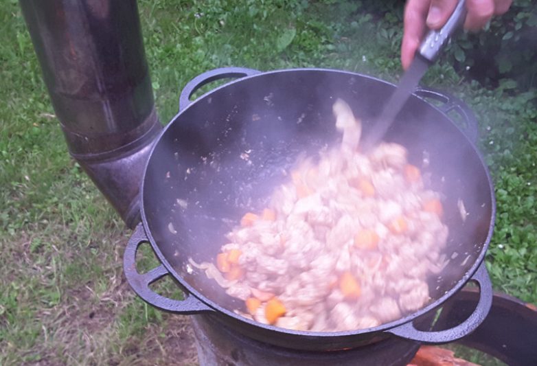 Далее выкладываем в казан лук и морковь и обжариваем до полуготовности.