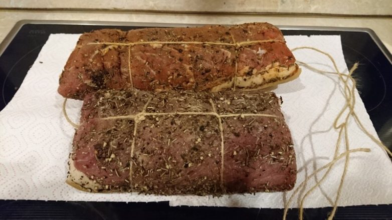 Время прошло, мясо просолилось, достаем, пленку убираем, обвязываем как нам удобно. Пахнет очень вкусно, в принципе уже можно резать и есть.