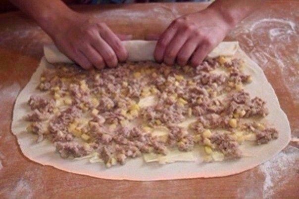 4. Тонко раскатываем тесто, выкладываем мясной фарш, на него -овощной.